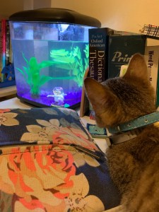 I observe how my 14-week old tabby Toro behaves from defecating in the litterbox to drinking from the water fountain, playing with his toys, and to watching his new finned friend, Hope, a Betta fish. Although they do not have the faculty to produce physiologically-driven emotional effects as complex as humans, my observation has yielded that cats exhibit a feline version of a continuum from pleasantness to unpleasantness. For instance, when I discipline Toro for not behaving, he does about-face and hides under the bed or goes to a corner of the room, sitting there like a mini sphinx statue, sulking and avoiding my eyes. Then in about 10 minutes or so, he slowly (and stealthily) approaches where I am while still keeping his feline pride in a way he doesn’t want to ingratiate himself with my favor. When finally arriving at his destination of Me, he announces his arrival with the unmissable “Meow,” with his eyes pleading for my petting. Cats may not have the same kind of grudge that we humans secretly harbor as in William Blakes’ ‘Poison Tree.” Yet, they possess the tactile feelings at the primary level, which can be akin to those exhibited by infants. Also, I don’t think raising a single cat will prevent her from socialization or emotional well-being. Most cats do not like to be with other cats unless they are littermates from birth.